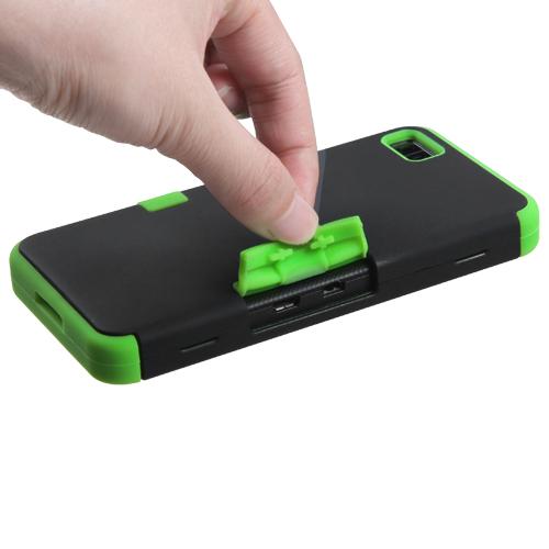 The Green and Black case is a 2 layer case that keeps your Blackberry Z10 well protected. The Blackberry Z10 gets fitted with the first layer of protection which is a rubberized silicone case that your phone sits firmly in which absorbs shocks and bumps keeping your phone well protected. The second layer is a hardened shell with a Green and Black design to it that snaps over the first layer and keeps your Blackberry Z10 well protected without adding bulkiness to the phone. The Blackberry case provides full access to the charging port, volume buttons and speaker and camera lenses so your Blackberry Z10 phone is fully functional while in the case.