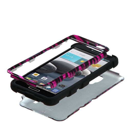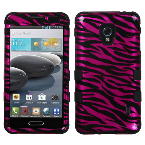 The Pink Zebra case is a 2 layer case that keeps your LG Optimus F6 well protected. The LG Optimus F6 gets fitted with the first layer of protection which is a rubberized silicone case that your phone sits firmly in which absorbs shocks and bumps keeping your phone well protected. The second layer is a hardened shell with a Pink Zebra design to it that snaps over the first layer and keeps your LG Optimus F6 well protected without adding bulkiness to the phone. The LG case provides full access to the charging port, volume buttons and speaker and camera lenses so your LG Optimus F6 phone is fully functional while in the case.